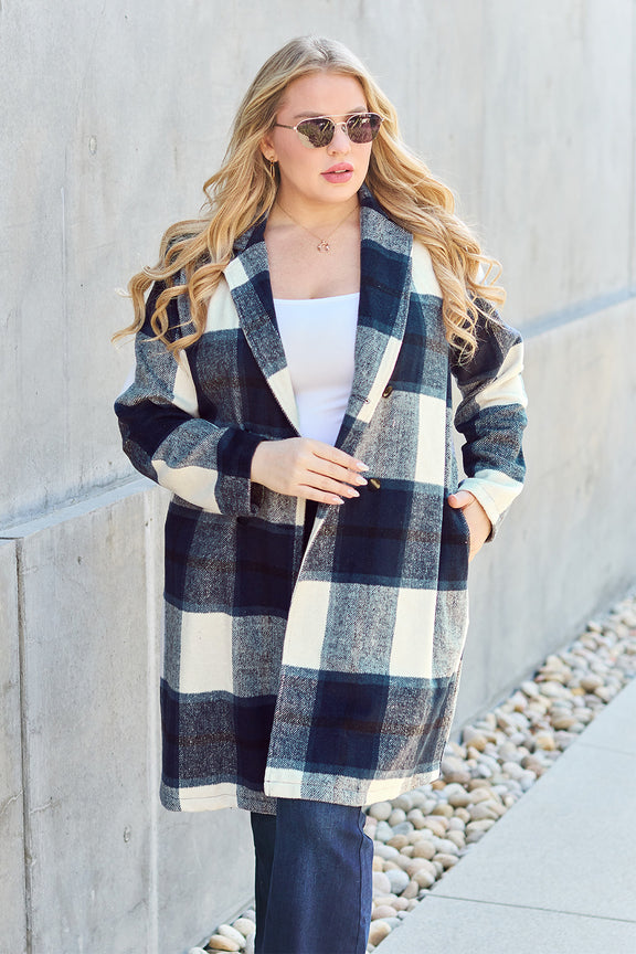 Double Take Full Size Plaid Button Up Lapel Collar Coat